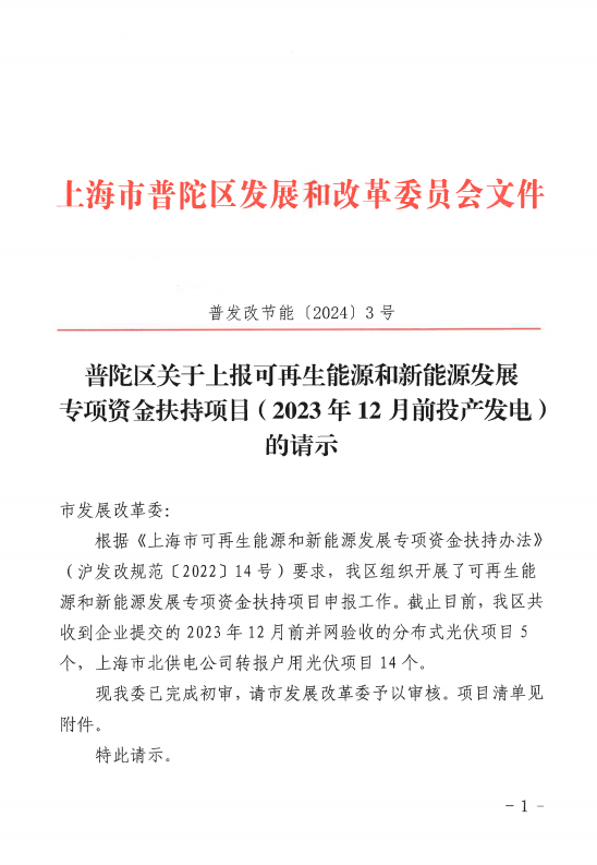 普陀区关于上报可再生能源和新能源发展专项资金扶持项目(2023年12月前投产发电)的请示