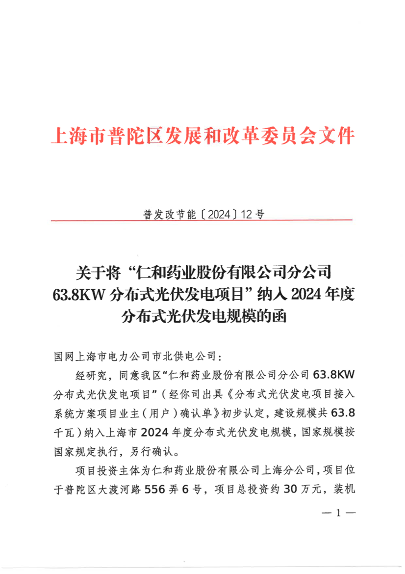 经研究,同意我区“仁和药业股份有限公司分公司63.8KW分布式光伏发电项目”(经你司出具《分布式光伏发电项目接入系统方案项目业主(用户)确认单》初步认定,建设规模共63.8千瓦)纳入上海市2024年度分布式光伏发电规模,国家规模按国家规定执行,另行确认。