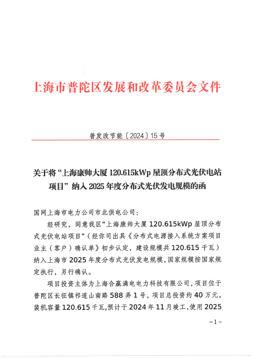 经研究,同意我区“上海康帅大厦120.615kWp屋顶分布式光伏电站项目”(经你司出具《分布式电源接入系统方案项目业主(客户)确认单》初步认定,建设规模共120.615千瓦)纳入上海市2025年度分布式光伏发电规模,国家规模按国家规定执行,另行确认。