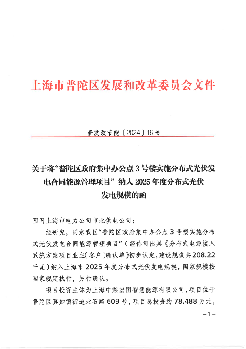 经研究,同意我区“普陀区政府集中办公点3号楼实施分布式光伏发电合同能源管理项目”(经你司出具《分布式电源接入系统方案项目业主(客户)确认单》初步认定,建设规模共208.22千瓦)纳入上海市2025年度分布式光伏发电规模,国家规模按国家规定执行,另行确认。