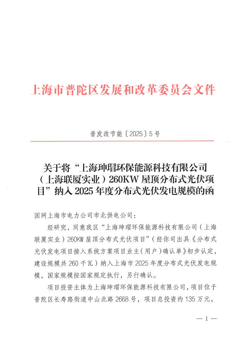 经研究,同意我区“上海珅瑁环保能源科技有限公司(上海联厦实业)260KW屋顶分布式光伏项目”(经你司出具《分布式光伏发电项目接入系统方案项目业主(用户)确认单》初步认定,建设规模共260千瓦)纳入上海市2025年度分布式光伏发电规模,国家规模按国家规定执行,另行确认。