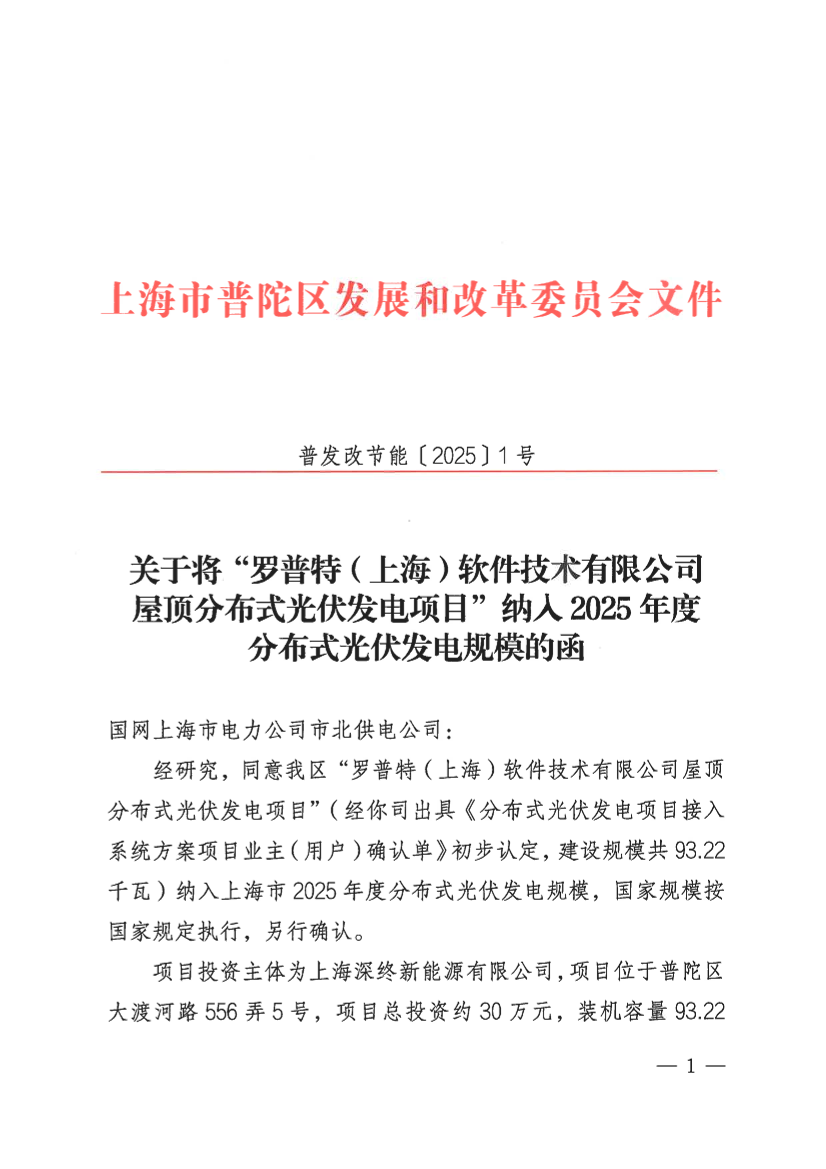 经研究,同意我区“罗普特(上海)软件技术有限公司屋顶分布式光伏发电项目”(经你司出具《分布式光伏发电项目接入系统方案项目业主(用户)确认单》初步认定,建设规模共93.22千瓦)纳入上海市2025年度分布式光伏发电规模,国家规模按国家规定执行,另行确认。