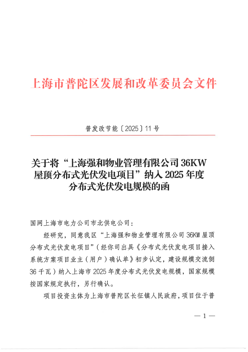 经研究,同意我区“上海强和物业管理有限公司36KW屋顶分布式光伏发电项目”(经你司出具《分布式光伏发电项目接入系统方案项目业主(用户)确认单》初步认定,建设规模交流侧36千瓦)纳入上海市2025年度分布式光伏发电规模,国家规模按国家规定执行,另行确认。