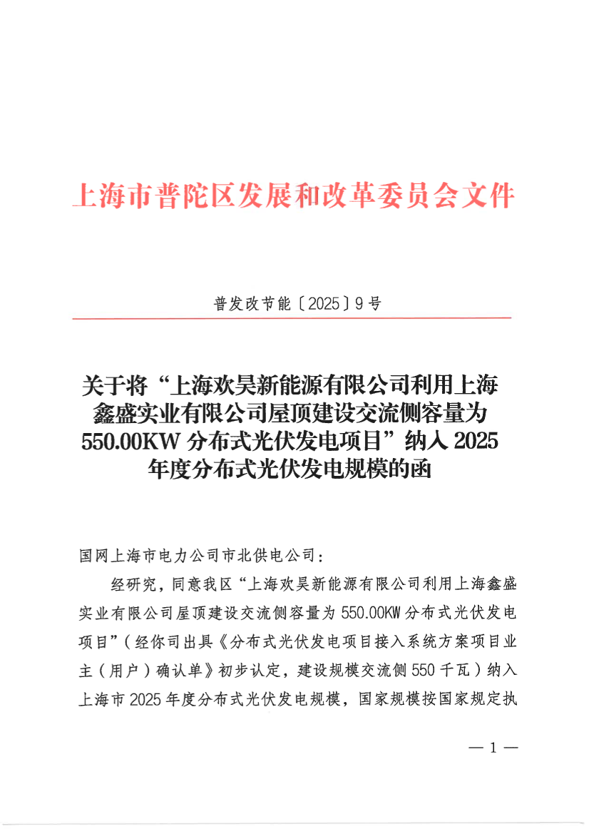 关于将“上海欢昊新能源有限公司利用上海鑫盛实业有限公司屋顶建设交流侧容量为550.00KW分布式光伏发电项目”纳入2025年度分布式光伏发电规模的函