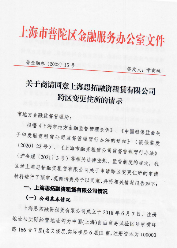 鉴于上海思拓融资租赁有限公司关于跨区变更住所的申请材料真实、准确、完整、合法、有效,复印件与原件审核无误,公司已做出郑重承诺,我区经充分研究,认为上海思拓融资租赁有限公司跨区变更住所事项基本符合《上海市地方金融监督管理条例》、《中国银保监会关于印发融资租赁公司监督管理暂行办法的通知》(银保监发〔2020〕22号)、《上海市融资租赁公司监督管理暂行办法》(沪金规〔2021〕3号)等相关政策法规、监管制度要求,且未发现公司存在重大违法违规或违反相关监管规定的行为,也未发现公司存在重大不良信用记录,现商请贵局同意上海思拓融资租赁有限公司关于跨区变更住所的申请。