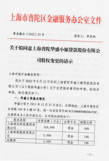 我办于2022年9月12日收到上海普陀华盛小额贷款股份有限公司(以下简称华盛小贷)关于变更股权事项的申请。经初步审核,相关情况如下: