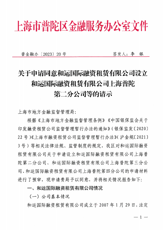 本次申请事项为设立分支机构。和运国际融资租赁有限公司申请设立和运国际融资租赁有限公司上海普陀第二分公司、和运国际融资租赁有限公司上海普陀第三分公司、和运国际融资租赁有限公司上海普陀第四分公司。