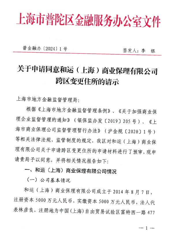 关于申请同意和运(上海)商业保理有限公司跨区变更住所的请示