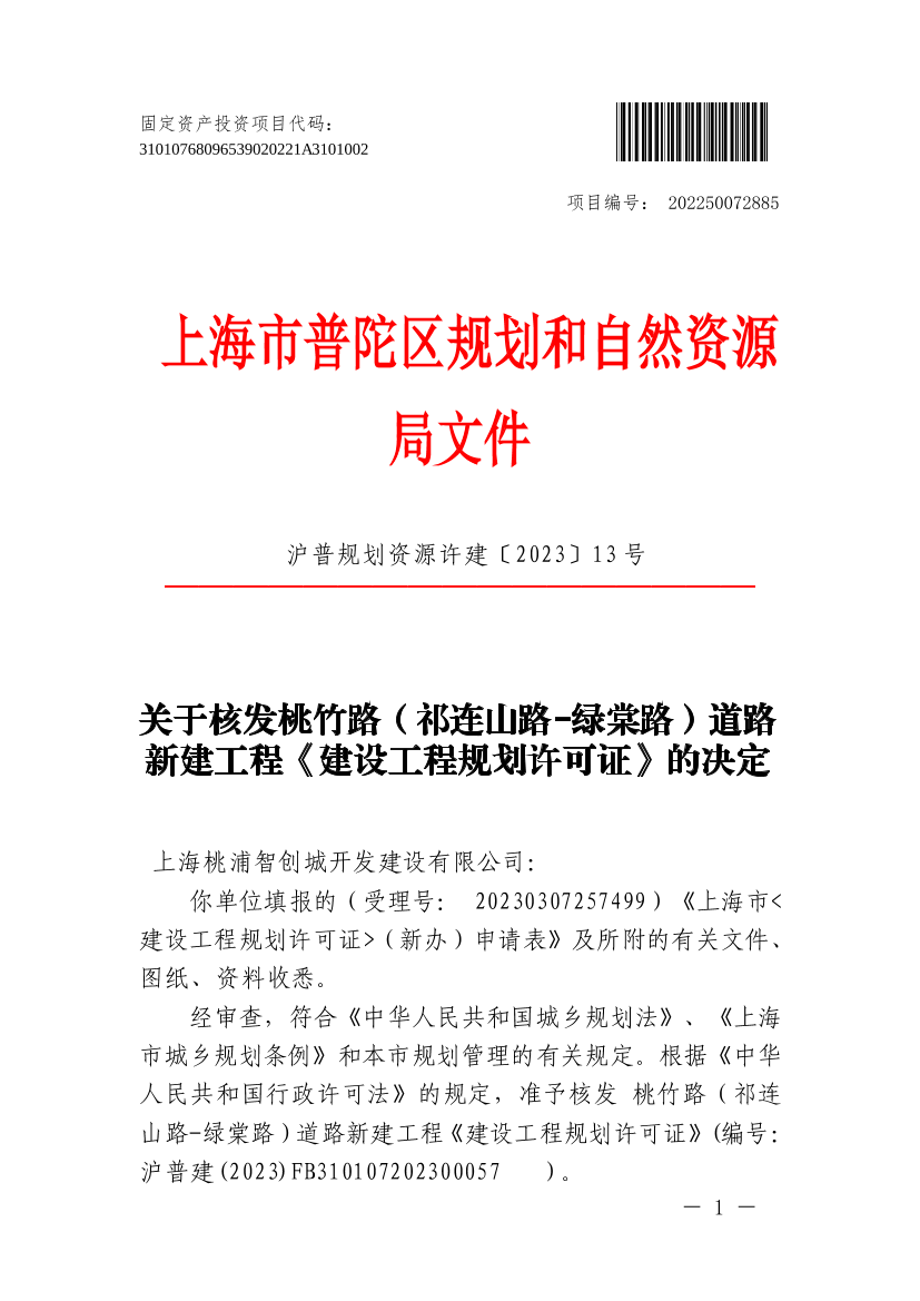 关于核发桃竹路(祁连山路-绿棠路)道路新建工程《建设工程规划许可证》的决定