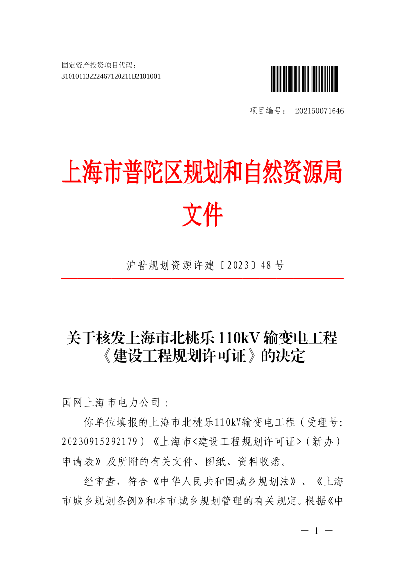 关于核发上海市北桃乐110kV输变电工程《建设工程规划许可证》的决定