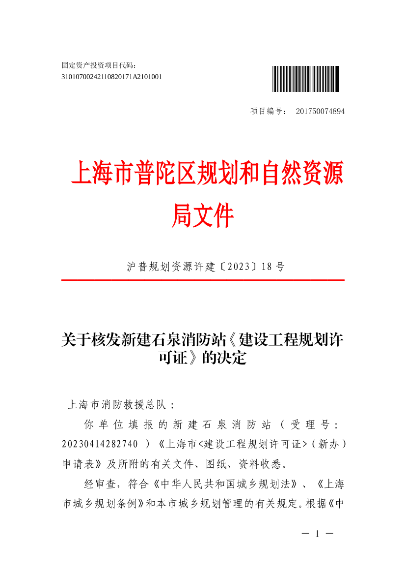 经审查,符合《中华人民共和国城乡规划法》、《上海市城乡规划条例》和本市城乡规划管理的有关规定。根据《中华人民共和国行政许可法》的规定,准予核发新建石泉消防站《建设工程规划许可证》(编号:沪普建(2023)FA310107202300422)。