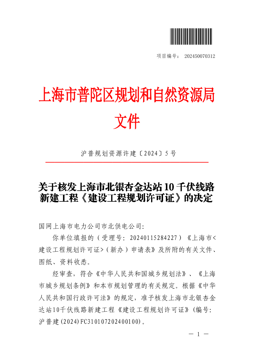 关于核发上海市北银杏金达站10千伏线路新建工程《建设工程规划许可证》的决定