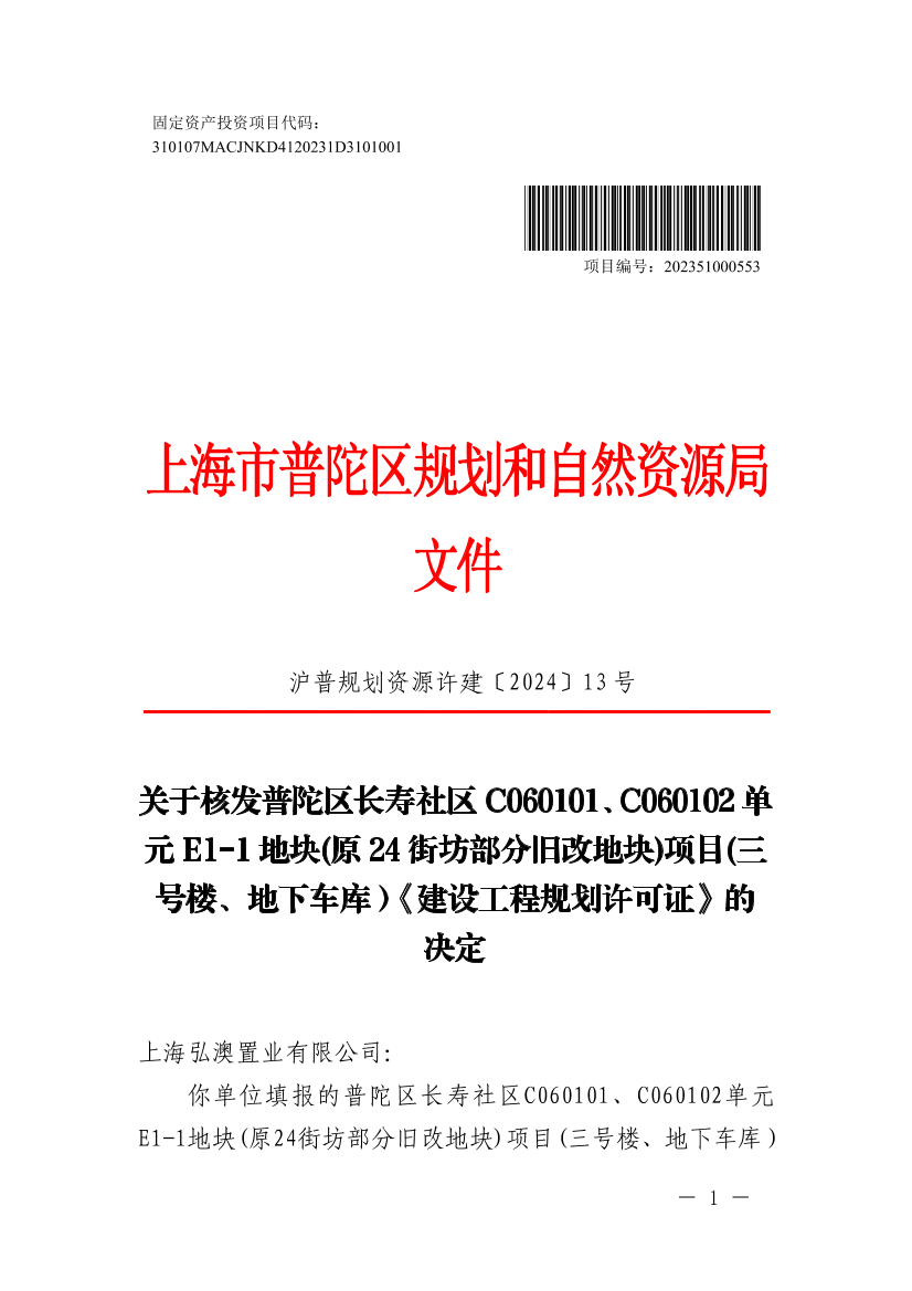 关于核发普陀区长寿社区C060101、C060102单元E1-1地块(原24街坊部分旧改地块)项目(三号楼、地下车库)《建设工程规划许可证》的决定