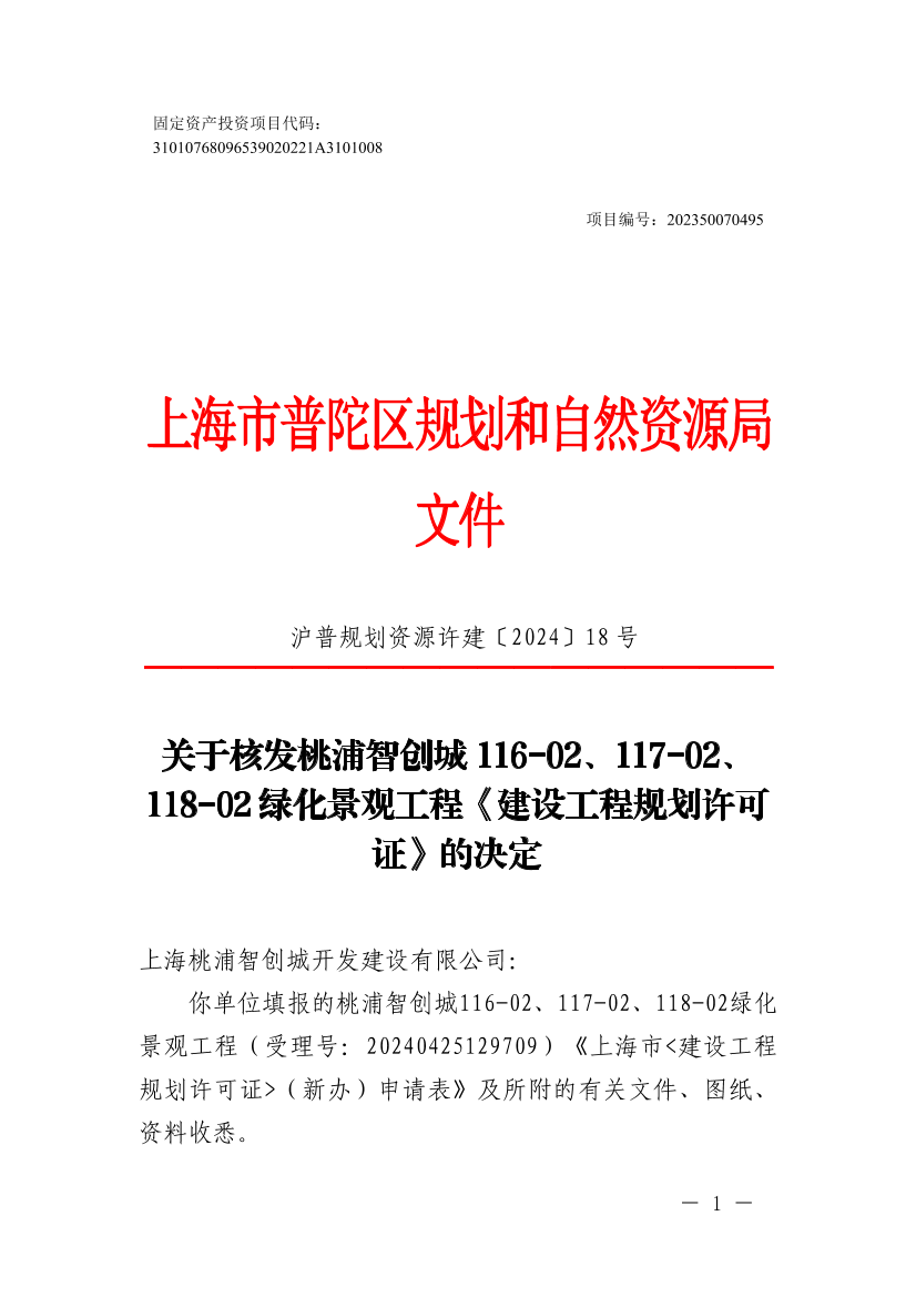 关于核发桃浦智创城116-02、117-02、118-02绿化景观工程《建设工程规划许可证》的决定