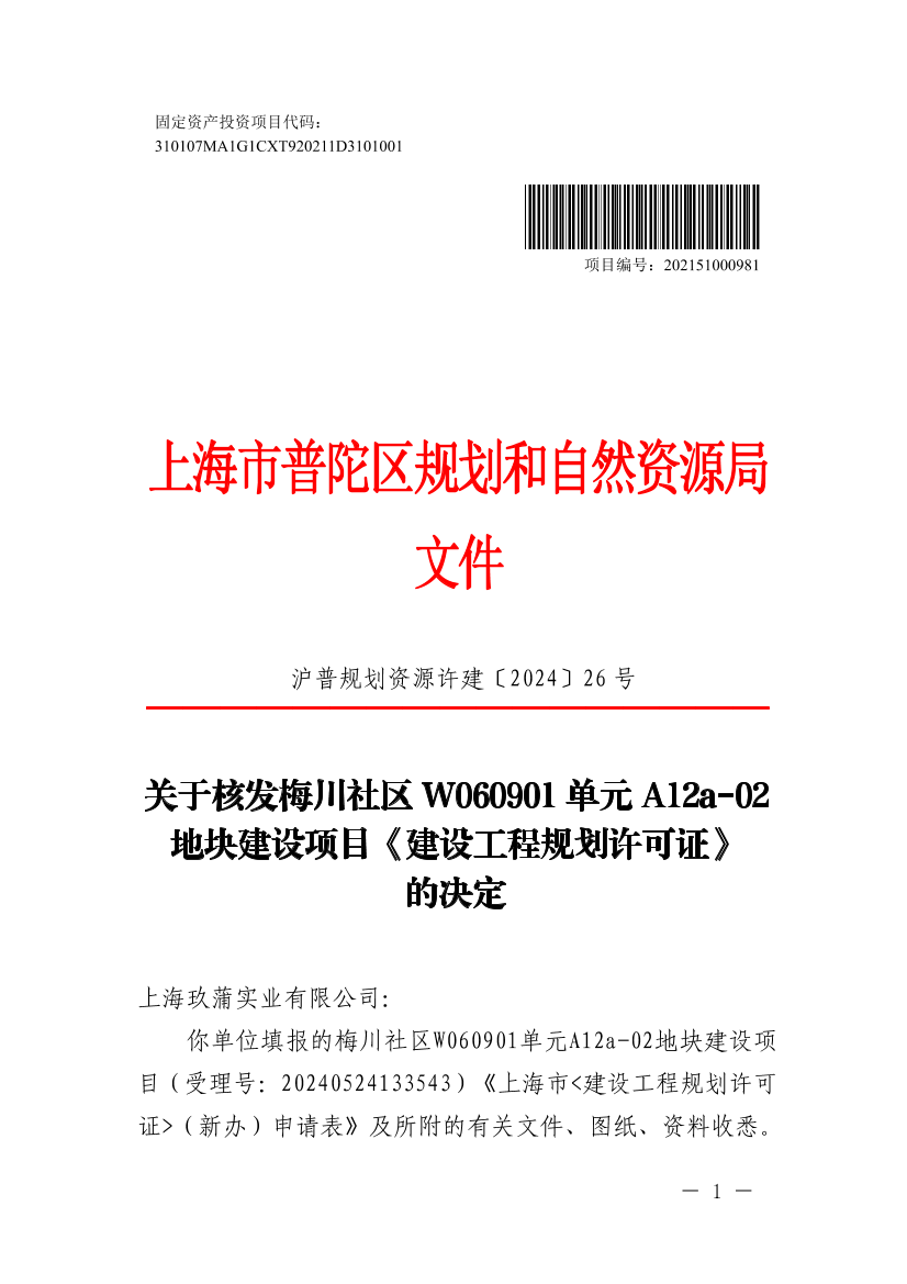 你单位填报的梅川社区W060901单元A12a-02地块建设项目(受理号:20240524133543)《上海市<建设工程规划许可证>(新办)申请表》及所附的有关文件、图纸、资料收悉。