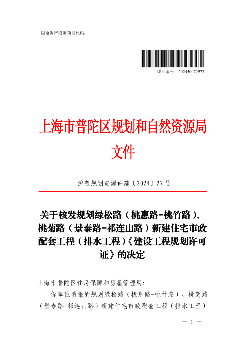 关于核发规划绿松路(桃惠路-桃竹路)、桃菊路(景泰路-祁连山路)新建住宅市政配套工程(排水工程)《建设工程规划许可证》的决定