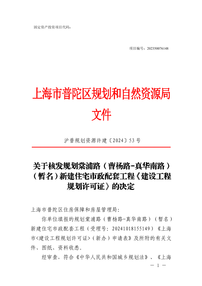 关于核发规划棠浦路(曹杨路-真华南路)(暂名)新建住宅市政配套工程《建设工程规划许可证》的决定
