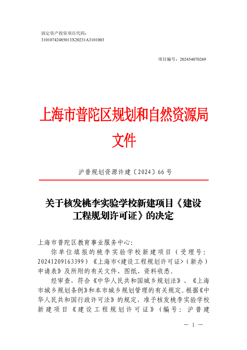 你单位填报的桃李实验学校新建项目(受理号:20241209163399)《上海市<建设工程规划许可证>(新办)申请表》及所附的有关文件、图纸、资料收悉。