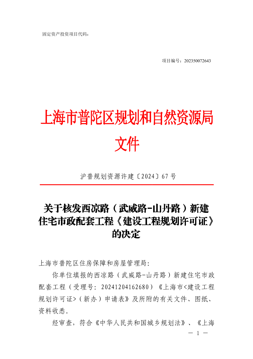 你单位填报的西凉路(武威路-山丹路)新建住宅市政配套工程(受理号:20241204162680)《上海市<建设工程规划许可证>(新办)申请表》及所附的有关文件、图纸、资料收悉。