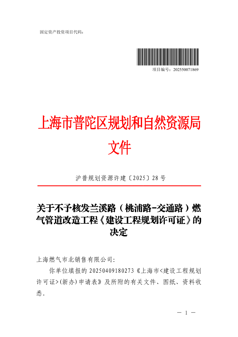 关于不予核发兰溪路(桃浦路-交通路)燃气管道改造工程《建设工程规划许可证》的决定