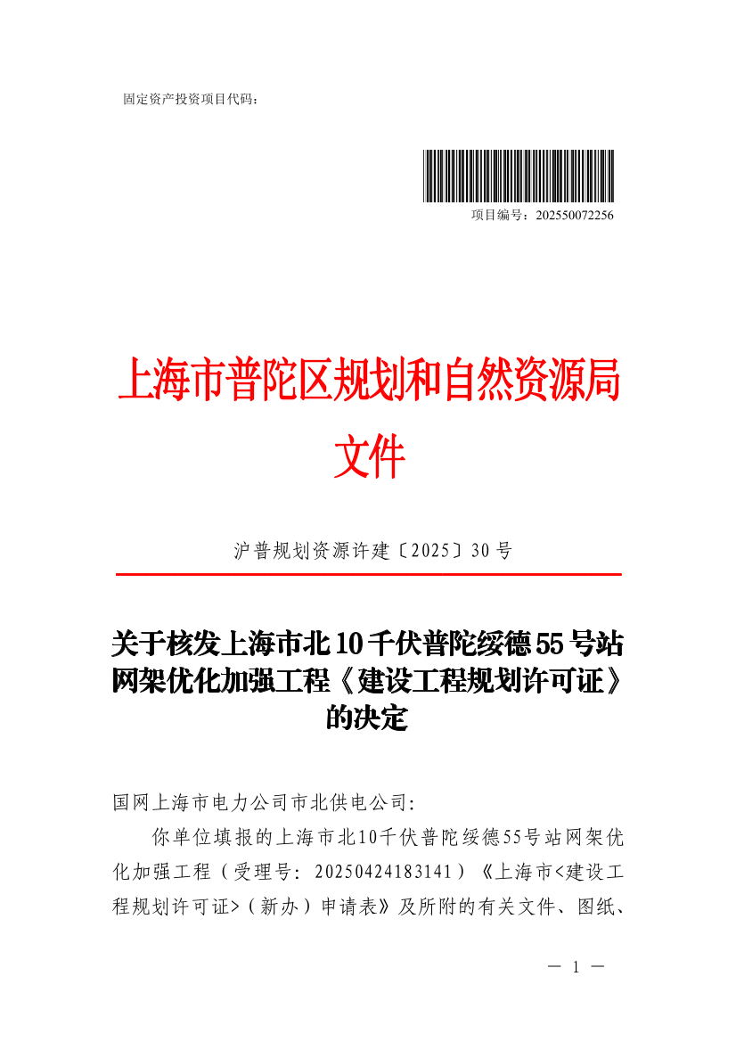 关于核发上海市北10千伏普陀绥德55号站网架优化加强工程《建设工程规划许可证》的决定