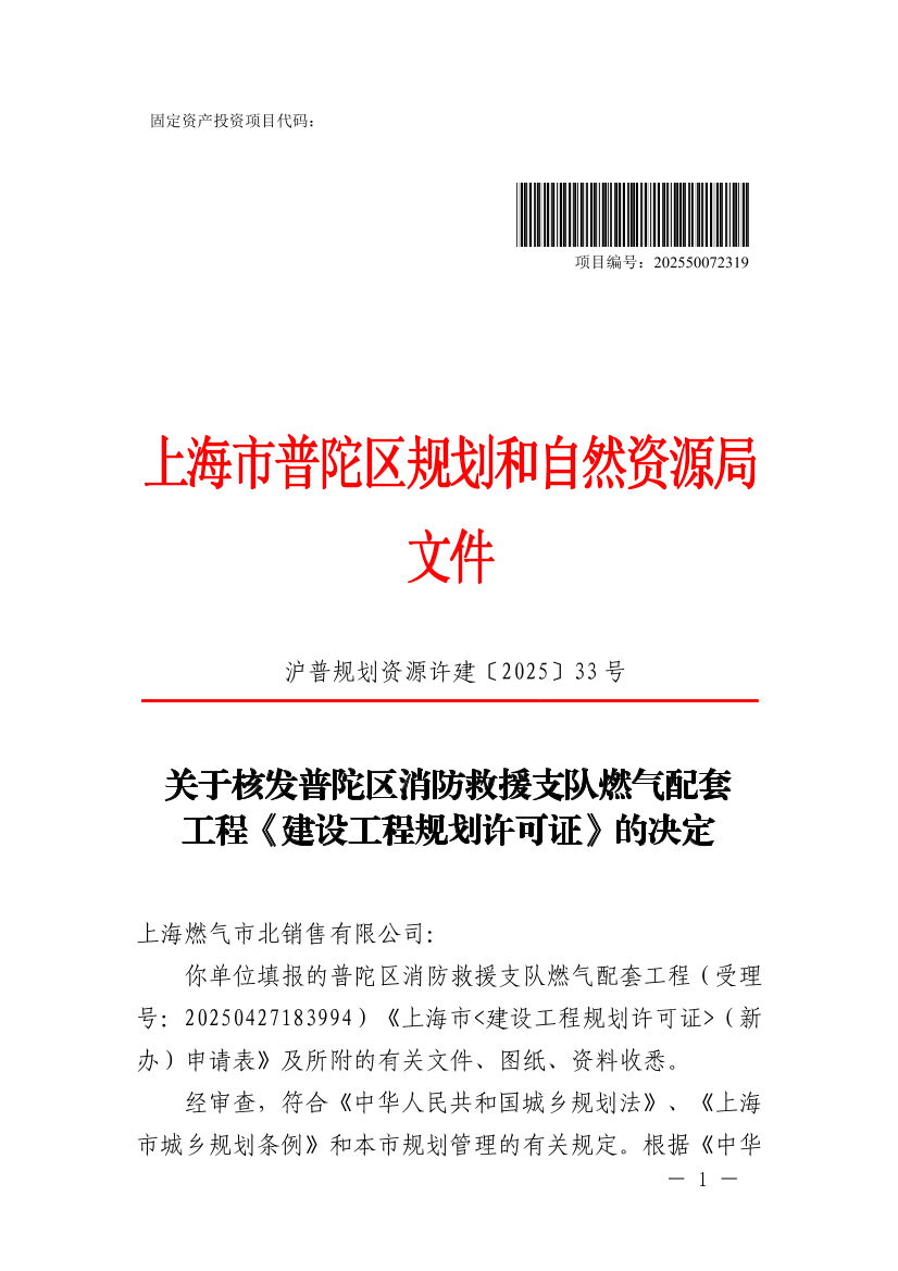 关于核发普陀区消防救援支队燃气配套工程《建设工程规划许可证》的决定