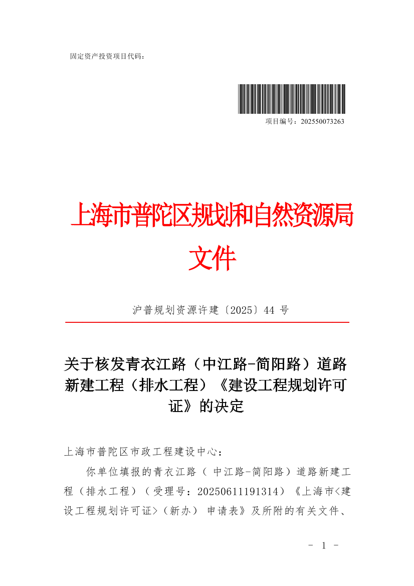 你单位填报的青衣江路(中江路-简阳路)道路新建工程(排水工程)(受理号:20250611191314)《上海市<建设工程规划许可证>(新办)申请表》及所附的有关文件、图纸、资料收悉。