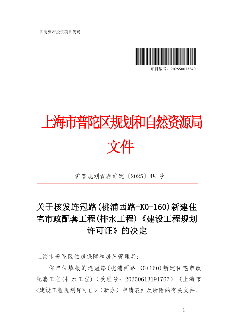 关于核发连冠路(桃浦西路-K0+160)新建住宅市政配套工程(排水工程)《建设工程规划许可证》的决定