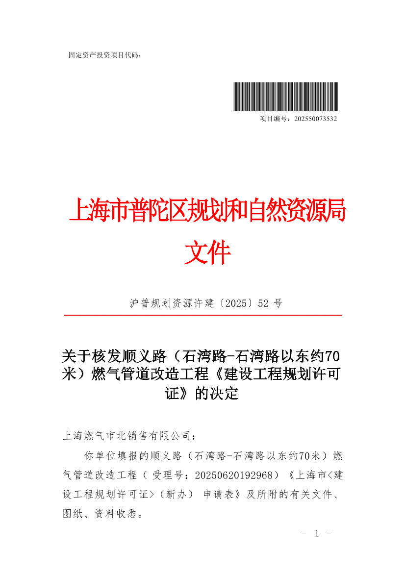 你单位填报的顺义路(石湾路-石湾路以东约70米)燃气管道改造工程(受理号:20250620192968)《上海市<建设工程规划许可证>(新办)申请表》及所附的有关文件、图纸、资料收悉。
