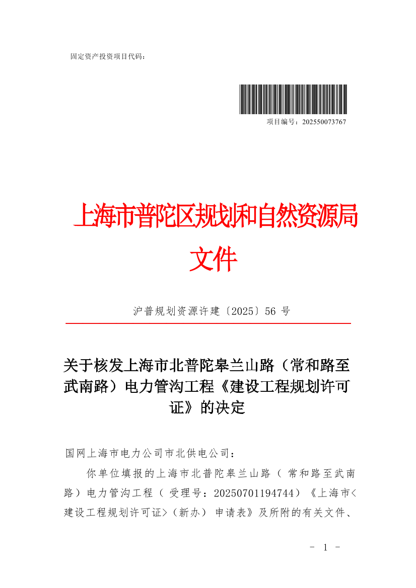 你单位填报的上海市北普陀皋兰山路(常和路至武南 路)电力管沟工程(受理号:20250701194744)《上海市< 建设工程规划许可证>(新办)申请表》及所附的有关文件、图纸、资料收悉。