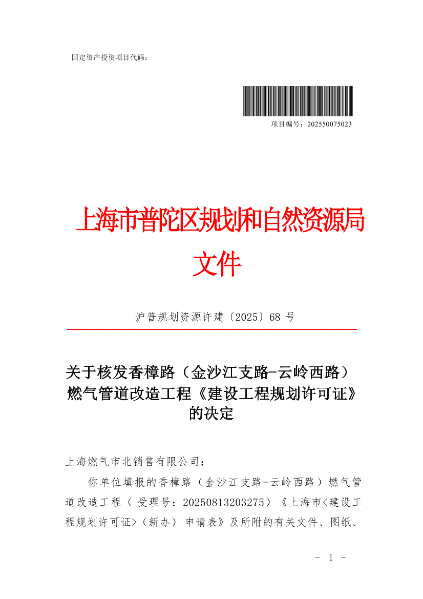 经审查,符合《中华人民共和国城乡规划法》、《上海市城乡规划条例》和本市规划管理的有关规定。根据《中华人民共和国行政许可法》的规定,准予核发香樟路(金沙江支路-云岭西路)燃气管道改造工程《建设工程规划许可证》(编号:沪普建(2025)FC310107202501379)。