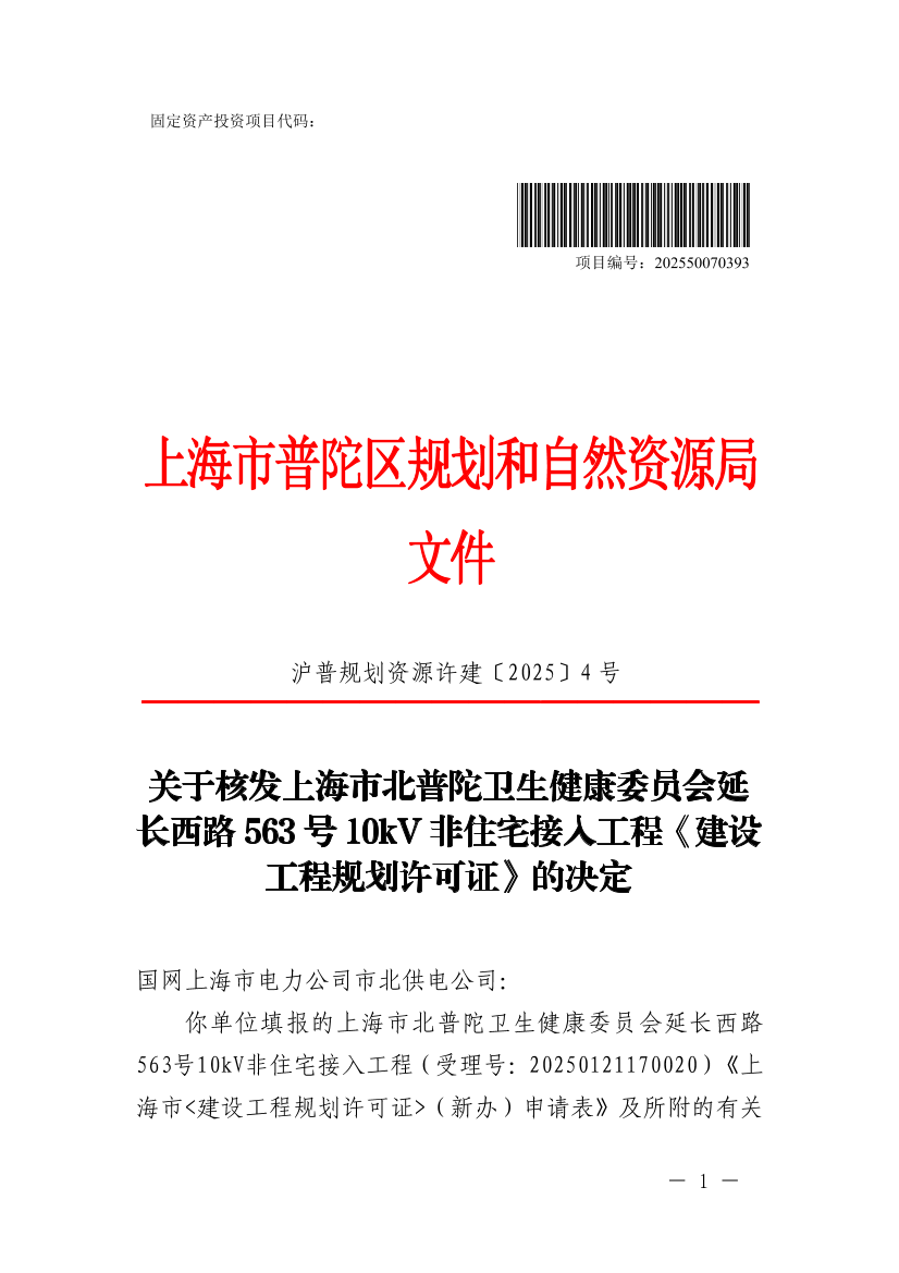 关于核发上海市北普陀卫生健康委员会延长西路563号10kV非住宅接入工程《建设工程规划许可证》的决定
