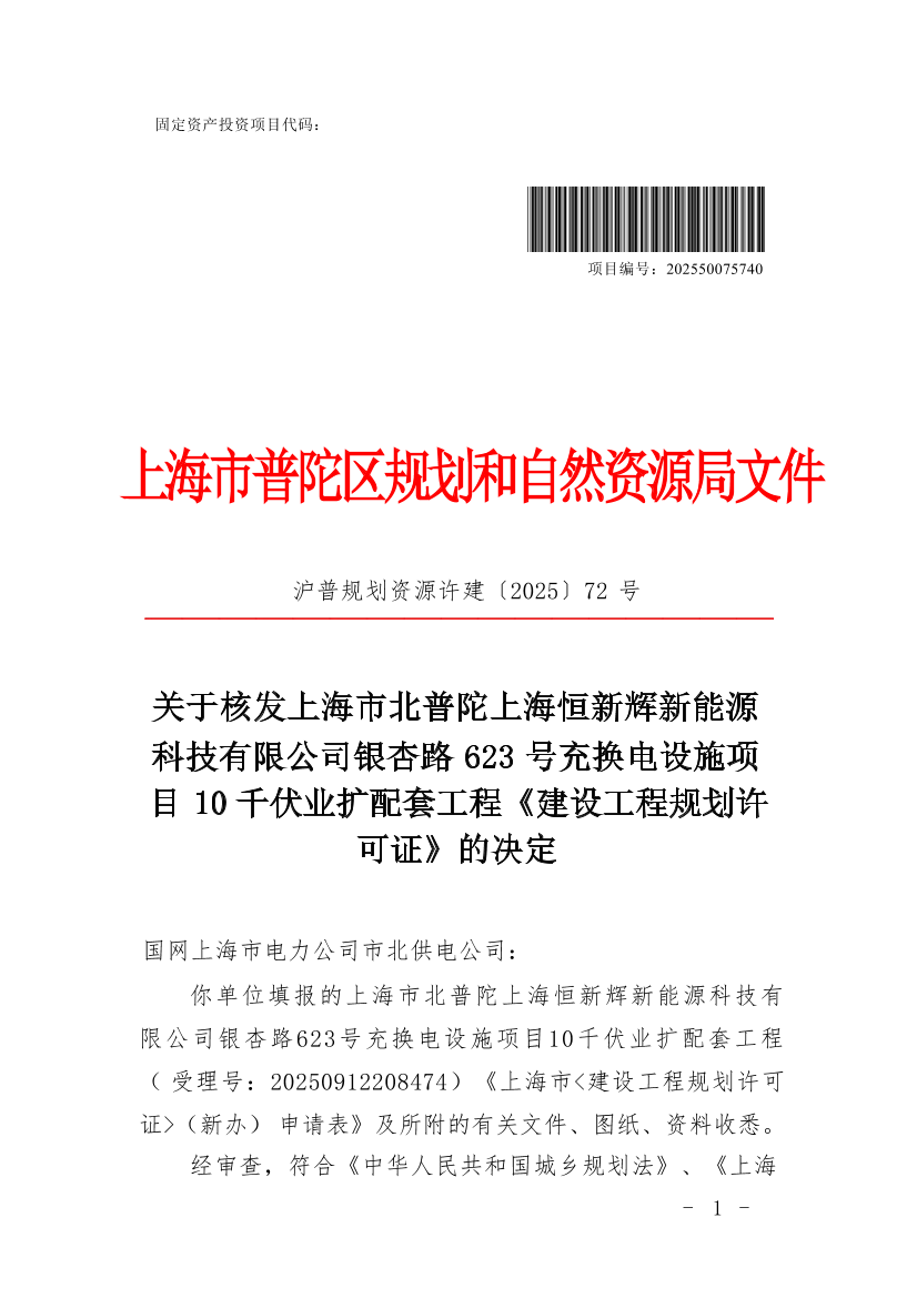 关于核发上海市北普陀上海恒新辉新能源科技有限公司银杏路623号充换电设施项目10千伏业扩配套工程《建设工程规划许可证》的决定