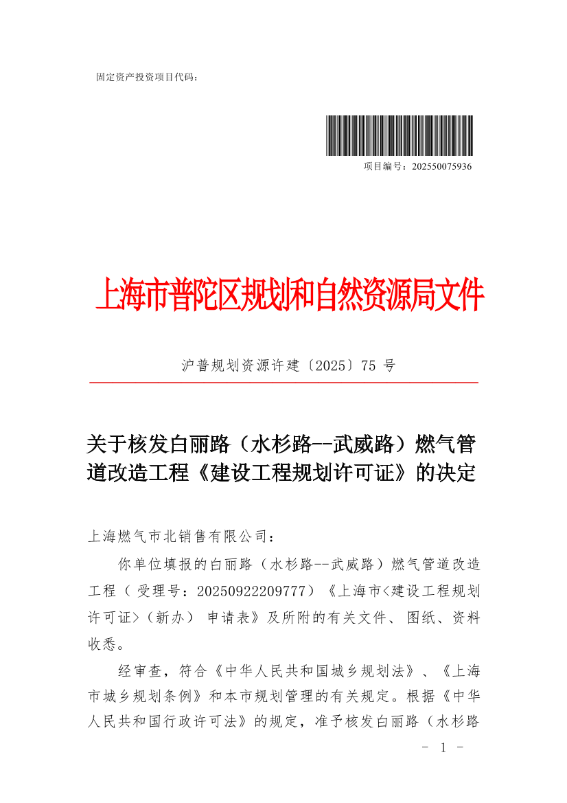 你单位填报的白丽路(水杉路--武威路)燃气管道改造工程( 受理号:20250922209777)《上海市<建设工程规划许可证>(新办)申请表》及所附的有关文件、 图纸、资料收悉。