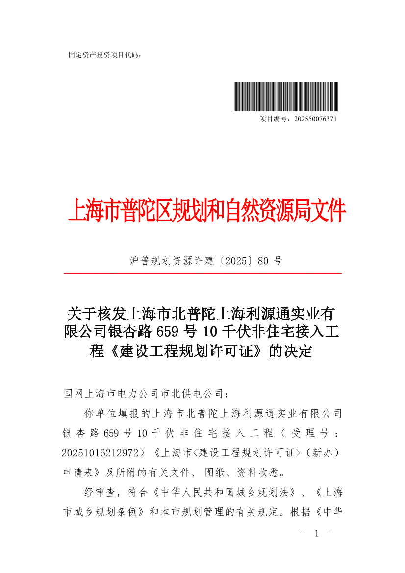你单位填报的上海市北普陀上海利源通实业有限公司银杏路659号10千伏非住宅接入工程(受理号:20251016212972)《上海市<建设工程规划许可证>(新办)申请表》及所附的有关文件、图纸、资料收悉。