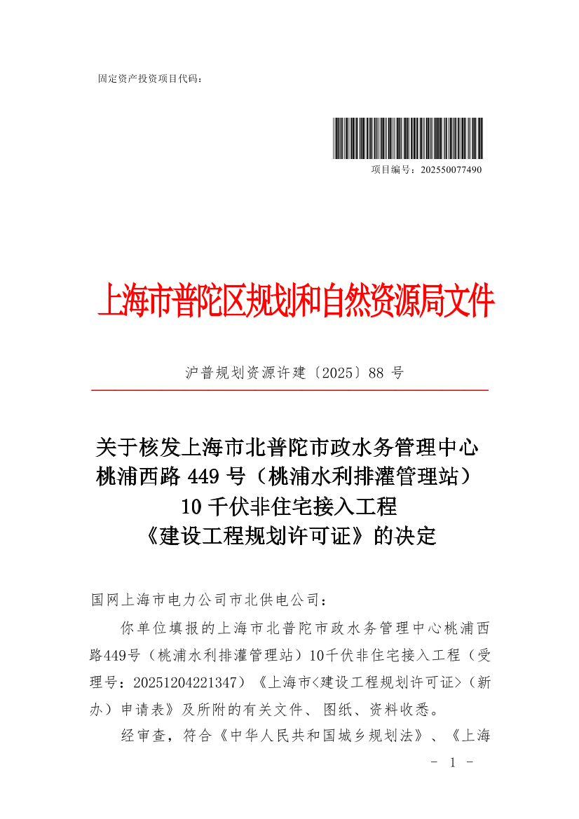 关于核发上海市北普陀市政水务管理中心桃浦西路449号(桃浦水利排灌管理站)10千伏非住宅接入工程《建设工程规划许可证》的决定
