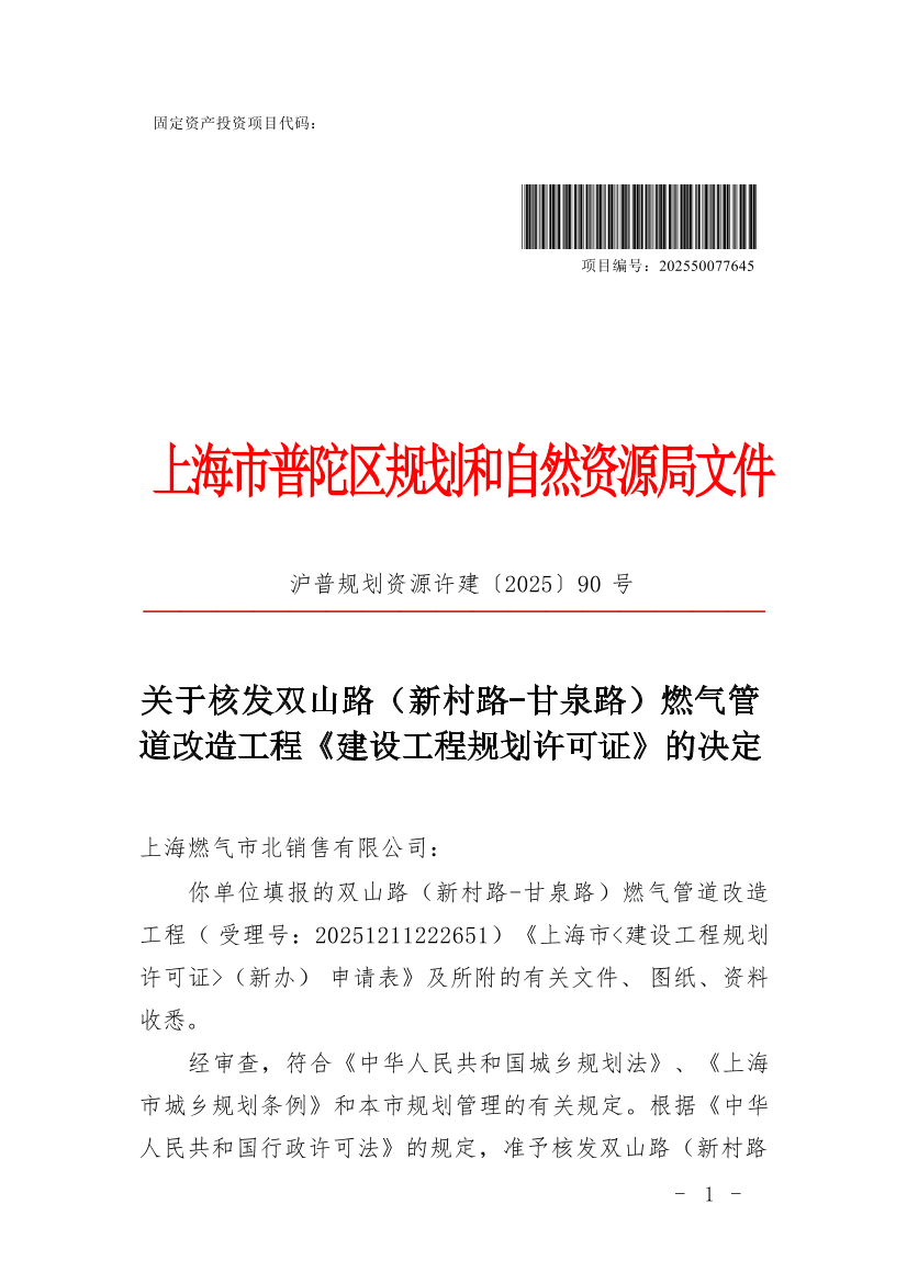 你单位填报的双山路(新村路-甘泉路)燃气管道改造工程(受理号:20251211222651)《上海市<建设工程规划许可证>(新办) 申请表》及所附的有关文件、图纸、资料收悉。