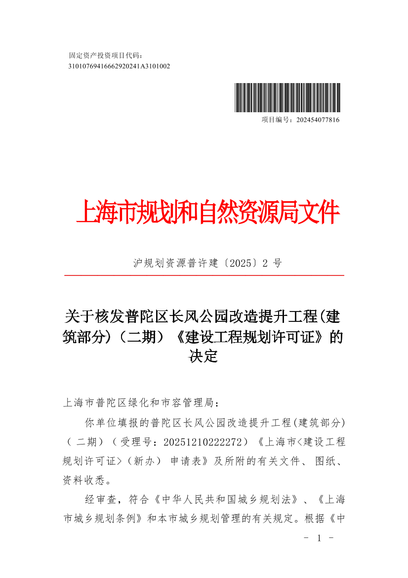 你单位填报的普陀区长风公园改造提升工程(建筑部分)(二期)(受理号:20251210222272)《上海市<建设工程规划许可证>(新办)申请表》及所附的有关文件、图纸、资料收悉。