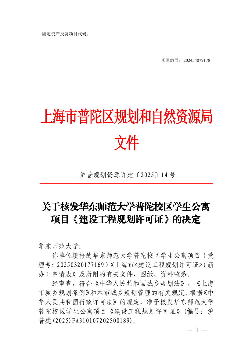 经审查,符合《中华人民共和国城乡规划法》、《上海市城乡规划条例》和本市城乡规划管理的有关规定。根据《中华人民共和国行政许可法》的规定,准予核发华东师范大学普陀校区学生公寓项目《建设工程规划许可证》(编号:沪普建(2025)FA310107202500189)。