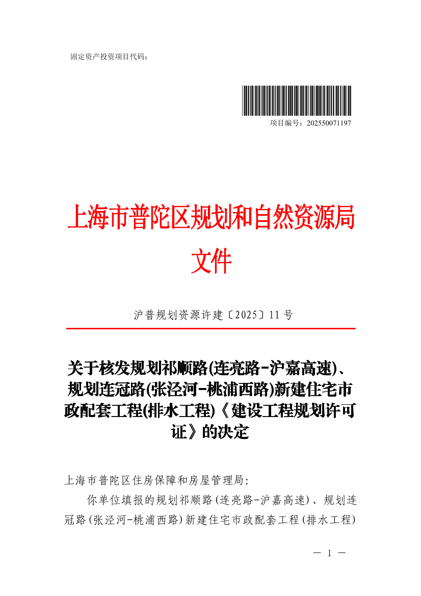 关于核发规划祁顺路(连亮路-沪嘉高速)、规划连冠路(张泾河-桃浦西路)新建住宅市政配套工程(排水工程)《建设工程规划许可证》的决定