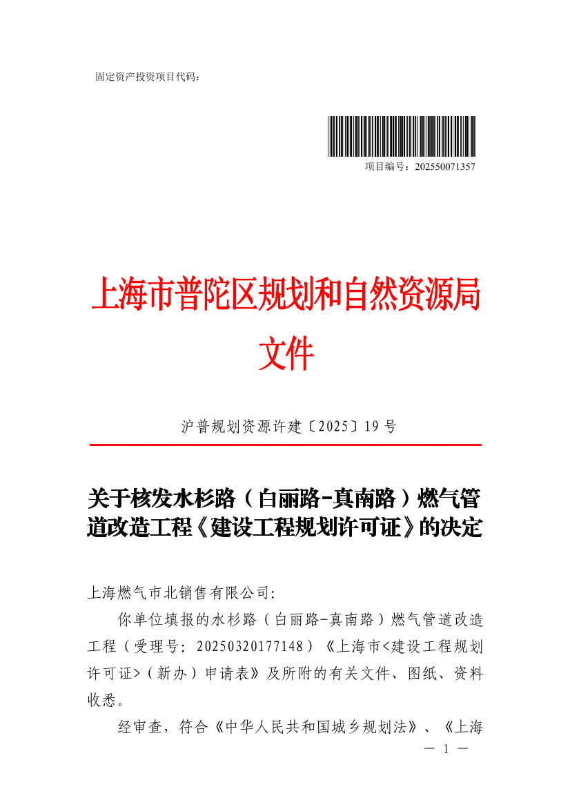 你单位填报的水杉路(白丽路-真南路)燃气管道改造工程(受理号:20250320177148)《上海市<建设工程规划许可证>(新办)申请表》及所附的有关文件、图纸、资料收悉。