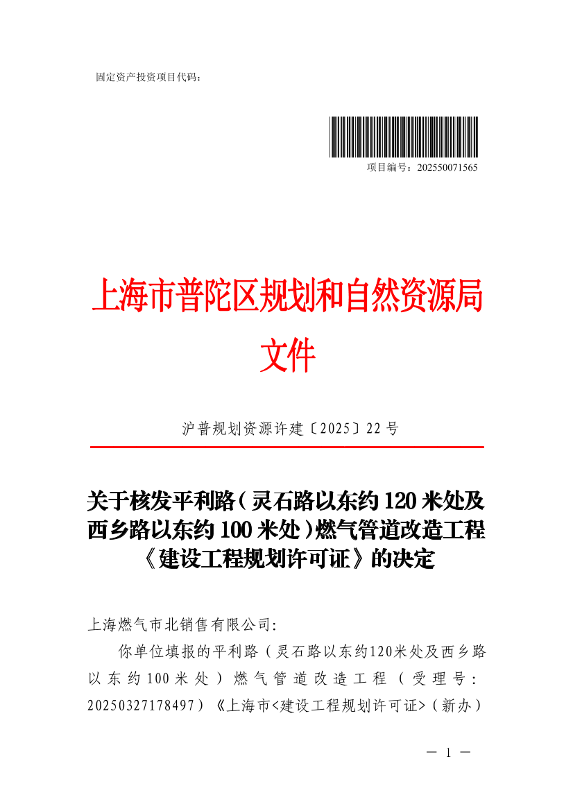 你单位填报的平利路(灵石路以东约120米处及西乡路以东约100米处)燃气管道改造工程(受理号:20250327178497)《上海市<建设工程规划许可证>(新办)申请表》及所附的有关文件、图纸、资料收悉。