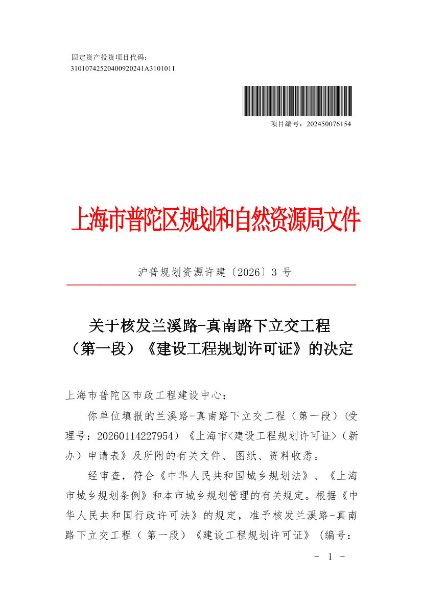 经审查,符合《中华人民共和国城乡规划法》、《上海市城乡规划条例》和本市城乡规划管理的有关规定。根据《中华人民共和国行政许可法》的规定,准予核发兰溪路-真南路下立交工程(第一段)《建设工程规划许可证》 (编号:沪普建(2026)FB310107202600011)。