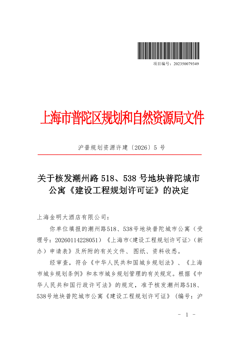 你单位填报的潮州路518、538号地块普陀城市公寓(受理号:20260114228051)《上海市<建设工程规划许可证>(新办)申请表》及所附的有关文件、图纸、资料收悉。