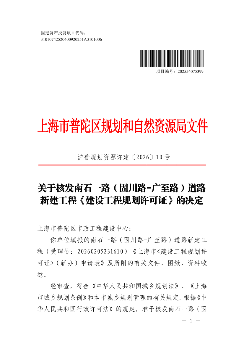 经审查,符合《中华人民共和国城乡规划法》 、《上海市城乡规划条例》和本市城乡规划管理的有关规定。根据《中华人民共和国行政许可法》的规定,准予核发南石一路( 固川路-广至路)道路新建工程《建设工程规划许可证》 (编号:沪普建(2026)FB310107202600037)。