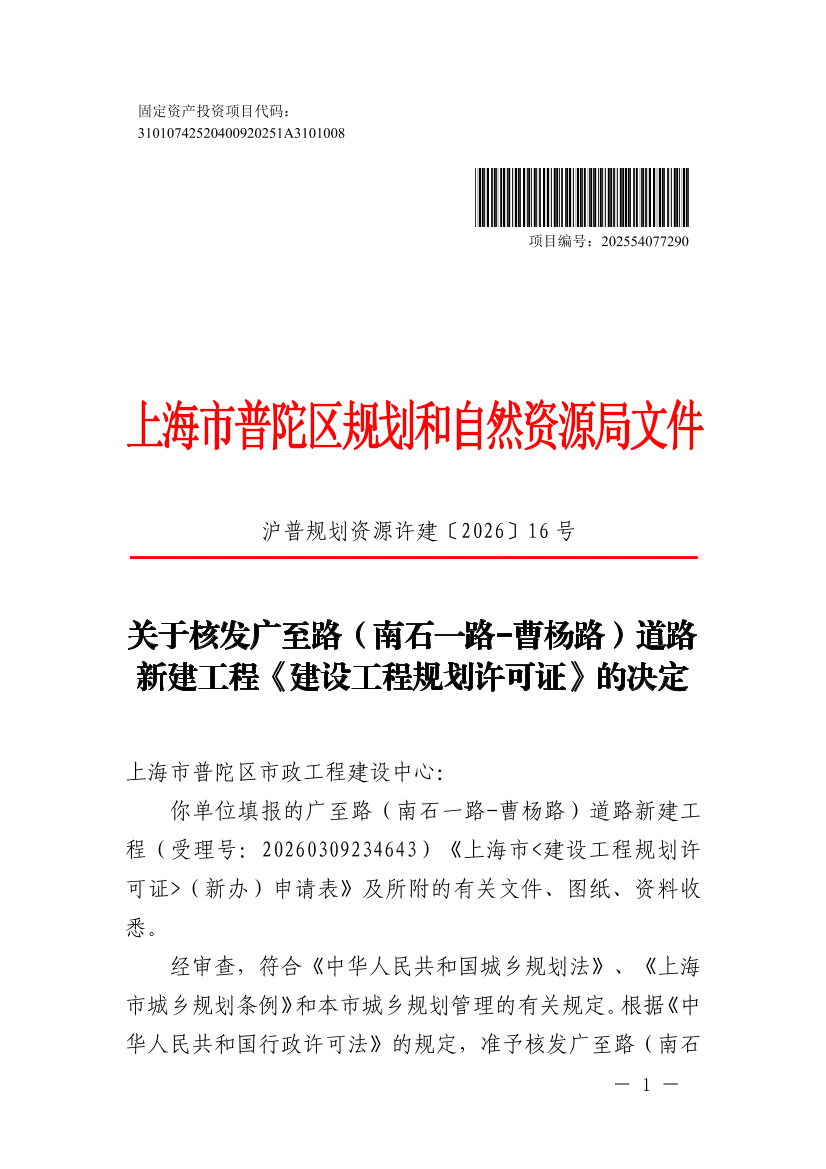 关于核发广至路(南石一路-曹杨路)道路新建工程《建设工程规划许可证》的决定