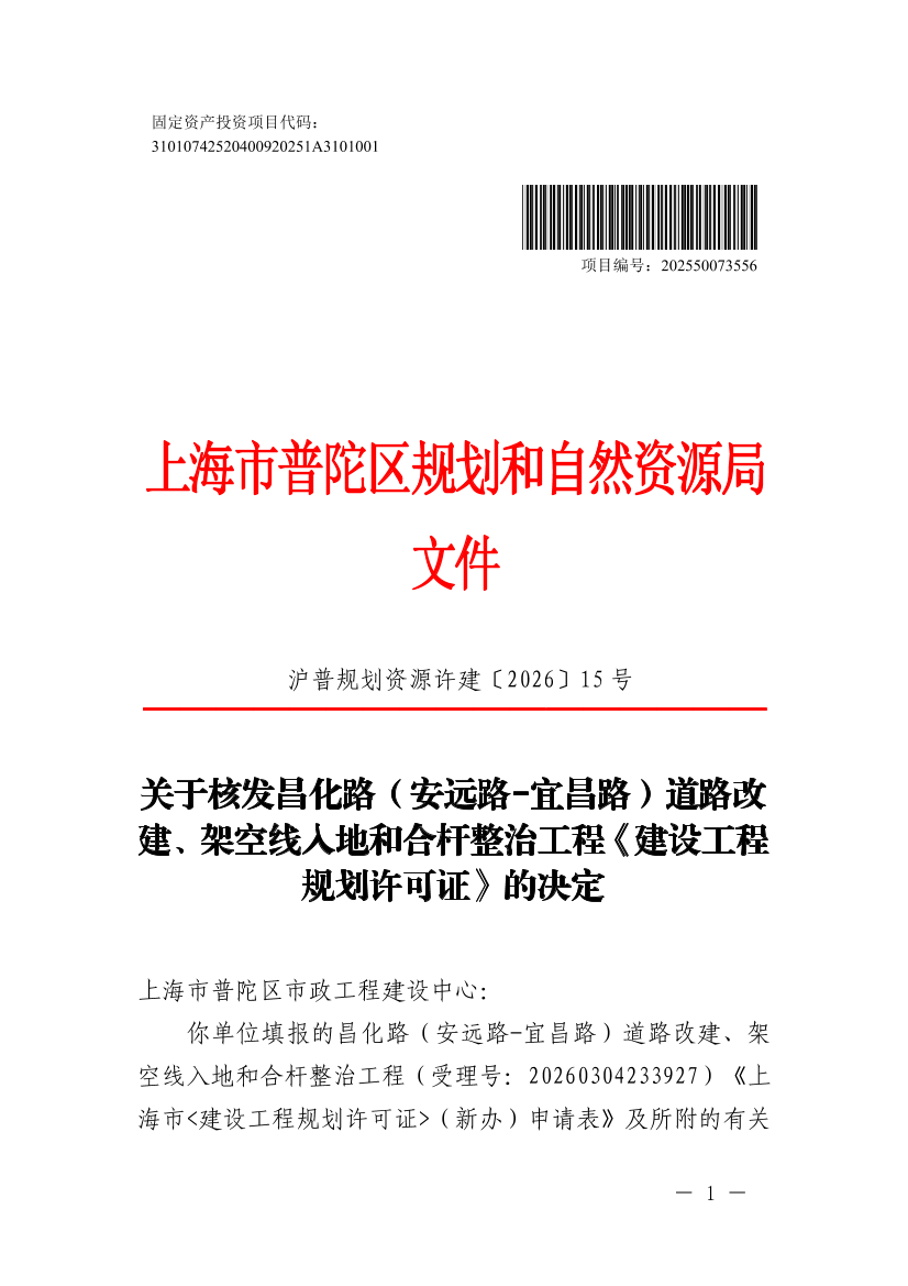 你单位填报的昌化路(安远路-宜昌路)道路改建、架空线入地和合杆整治工程(受理号:20260304233927 )《上海市<建设工程规划许可证>(新办)申请表》及所附的有关文件、图纸、资料收悉。