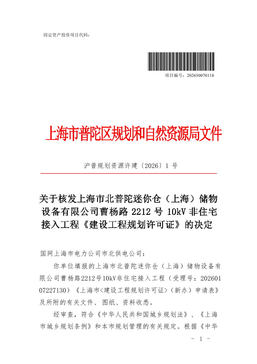 你单位填报的上海市北普陀迷你仓(上海)储物设备有限公司曹杨路2212号10kV非住宅接入工程(受理号:202601 07227130)《上海市<建设工程规划许可证>(新办)申请表》及所附的有关文件、图纸、资料收悉。