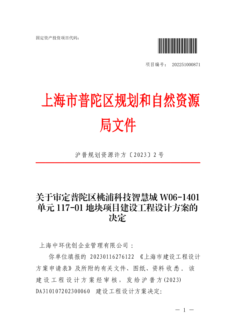 关于审定普陀区桃浦科技智慧城W06-1401单元117-01地块项目建设工程设计方案的决定