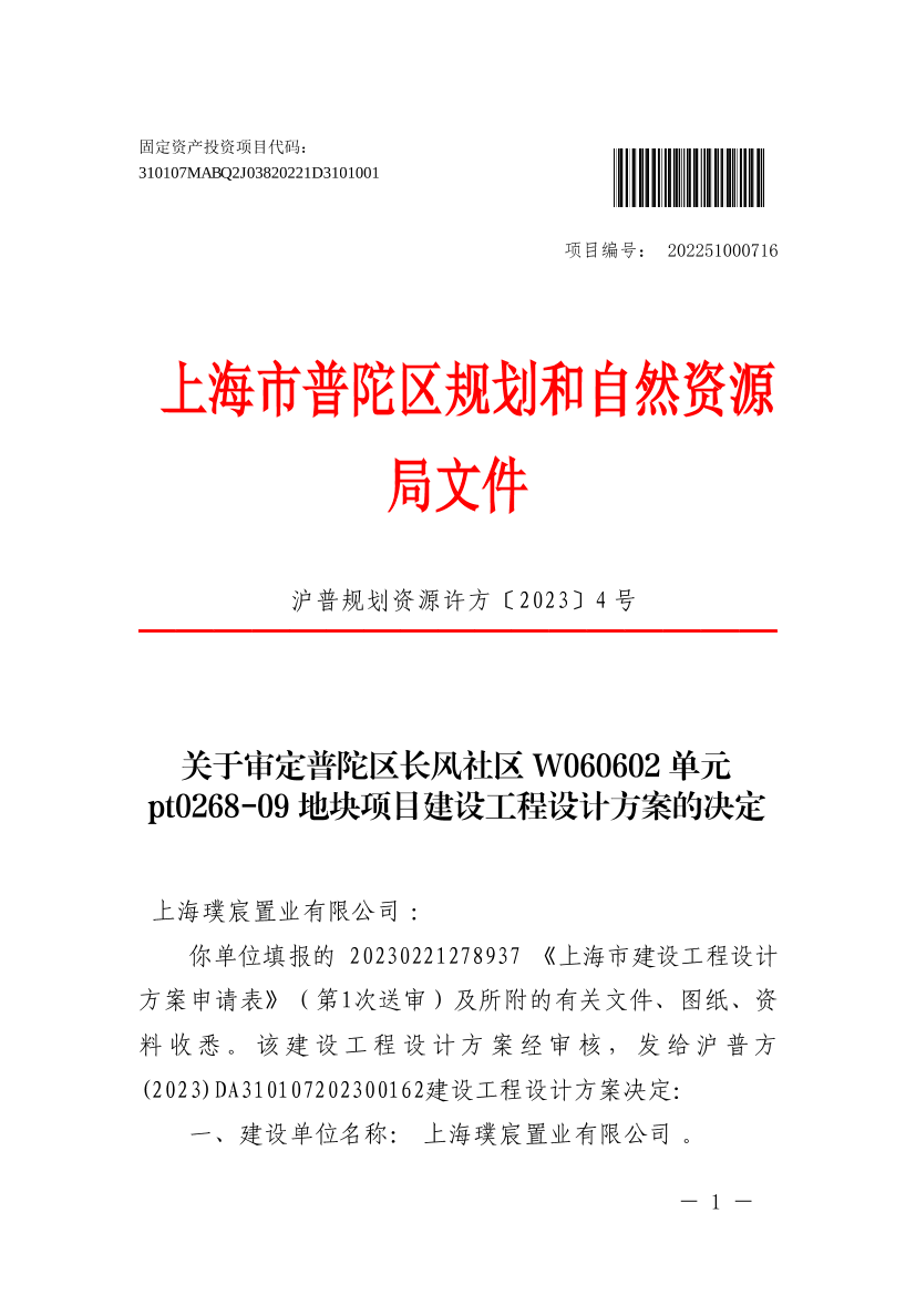 关于审定普陀区长风社区W060602单元pt0268-09地块项目建设工程设计方案的决定